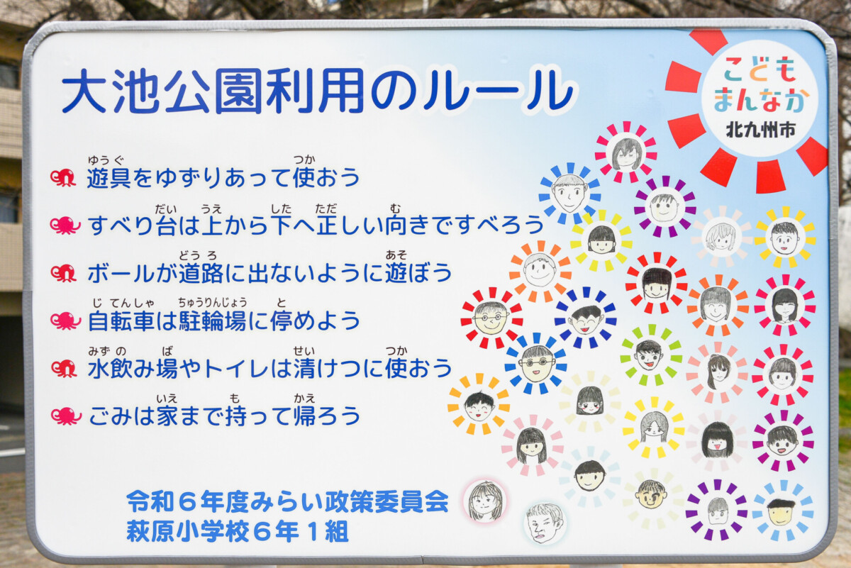 園内には、「遊具をゆずりあって使おう」や「すべり台は上から下へ正しい向きですべろう」など地元の小学生が自分たちで考えたルールの看板が新設されました。