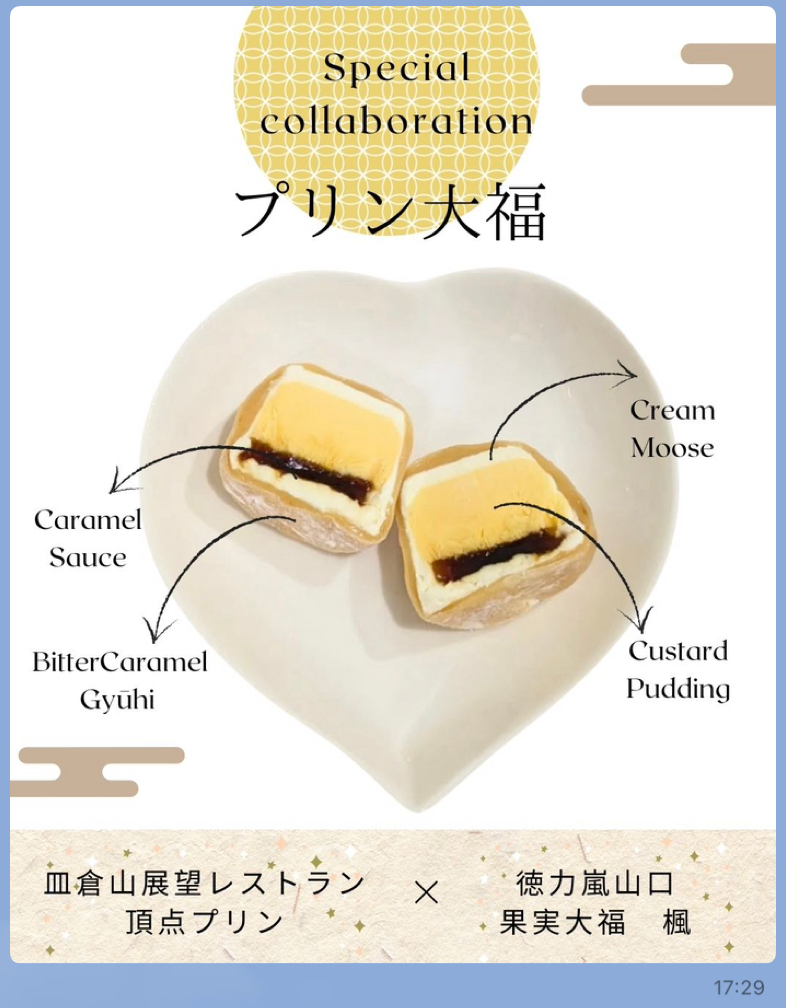 皿倉山展望レストラン天宮さんで完売必須の大人気商品「頂点プリン」とのコラボ大福を販売します。「頂点プリン」は、なめらかで濃厚なプリンで、楓特性のクリーム&ビターキャラメルが香る求肥が相性抜群のとろける大福が完成しました!