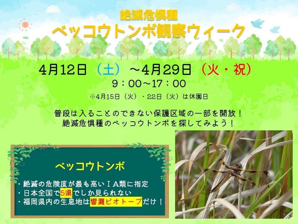 福岡県内では響灘ビオトープでしか見られず、普段は入ることのできない保護区域の一部を期間限定で開放します!絶滅危惧種のベッコウトンボを探して観察してみませんか?