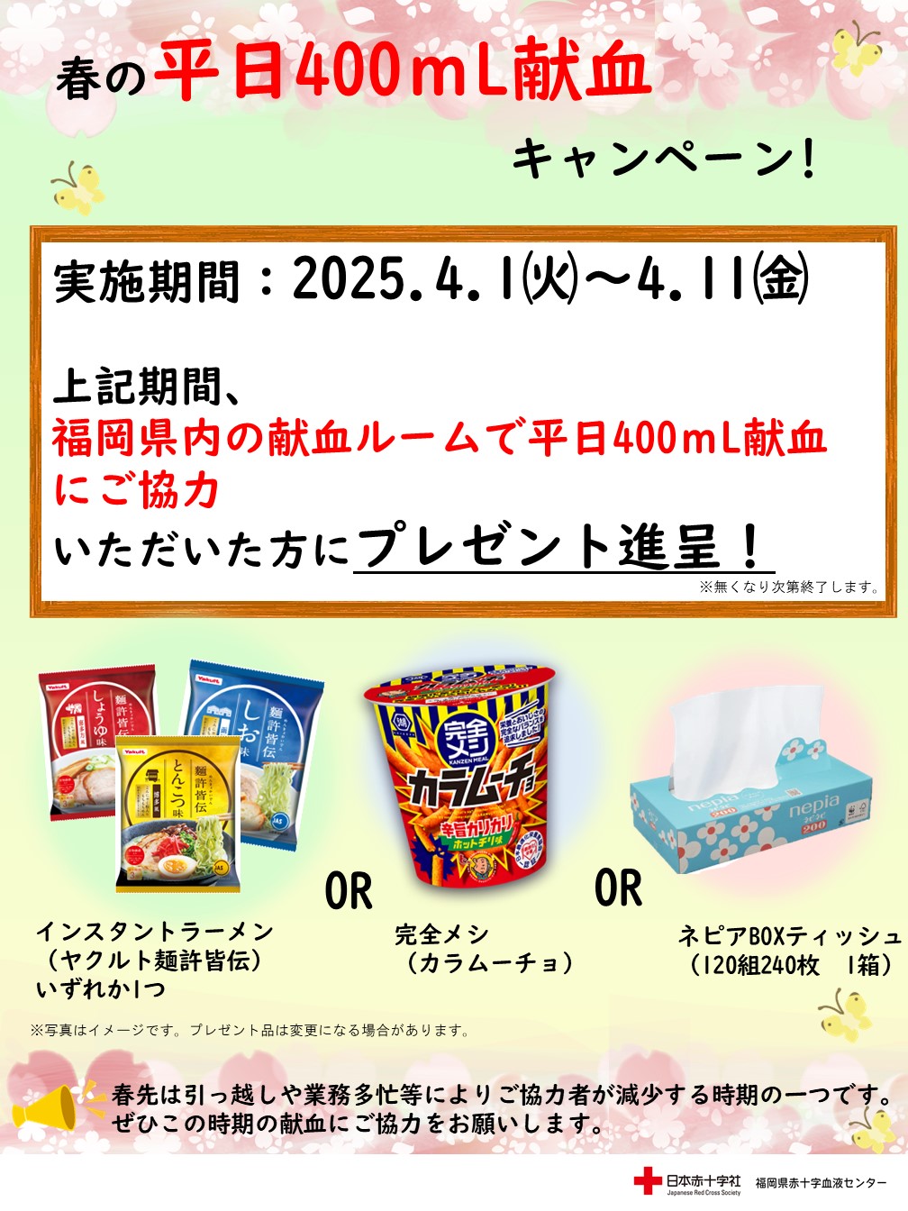 【献血ルーム限定】春の平日400mL献血キャンペーン実施!/福岡県赤十字血液センター北九州事業所
