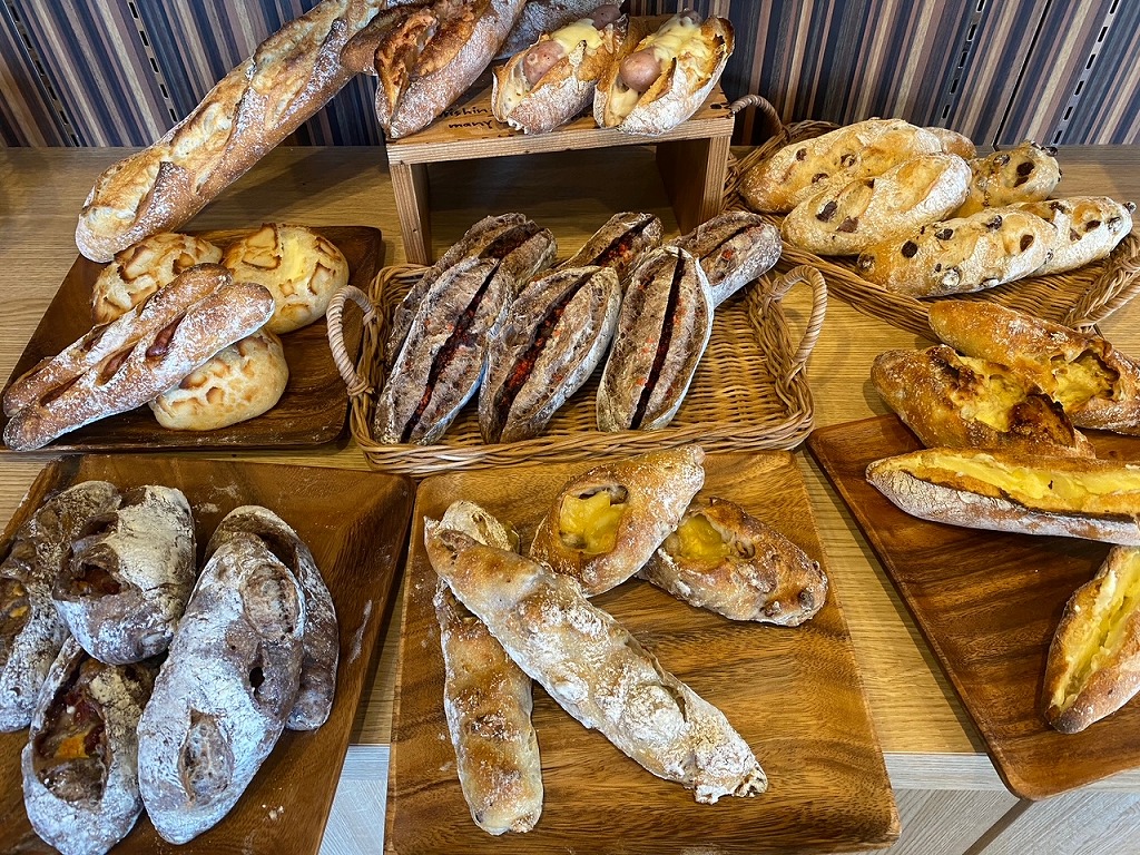 国産小麦を100%使用し、水分多めで作っているハード系のパンは歯切れのよさが特徴。菓子パンは牛乳やバター、卵をたっぷりと使い、しっとりしたやわらかめの仕上がりになっています。食パンはふんわりやわらかく、そのまま食べてもほんのり甘い“生食パン”で、購入後2、3日経ってもやわらかいままだそう。