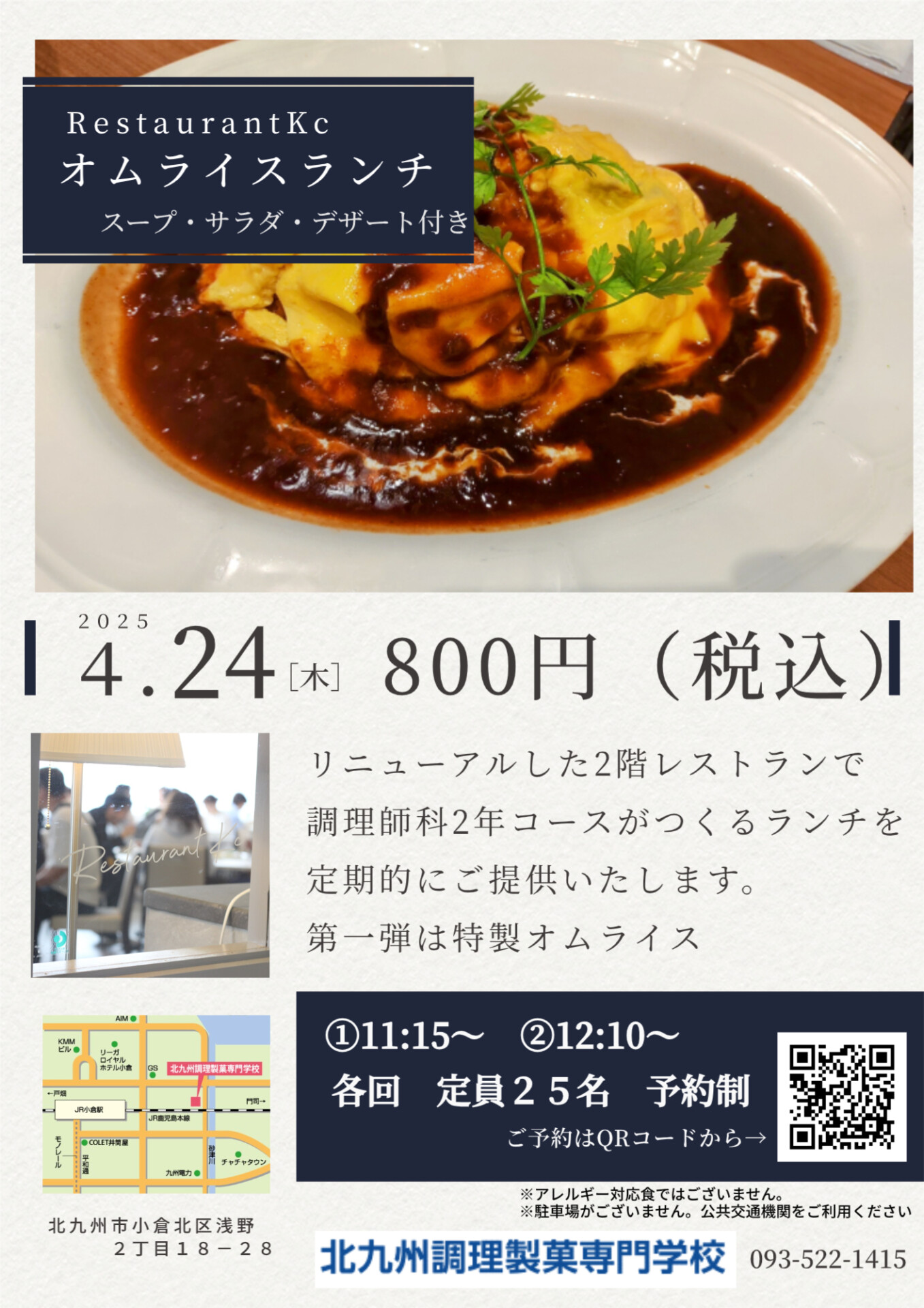 北九州調理製菓専門学校が開催する「RestaurantKc.」が4月からオープンします。「RestaurantKc.」は、食の仕事を目指す学生が調理をするレストラン。第一弾は<特製オムライスランチ>です。北九州の専門学校で唯一の調理師養成施設、この機会にぜひお立ち寄りください。