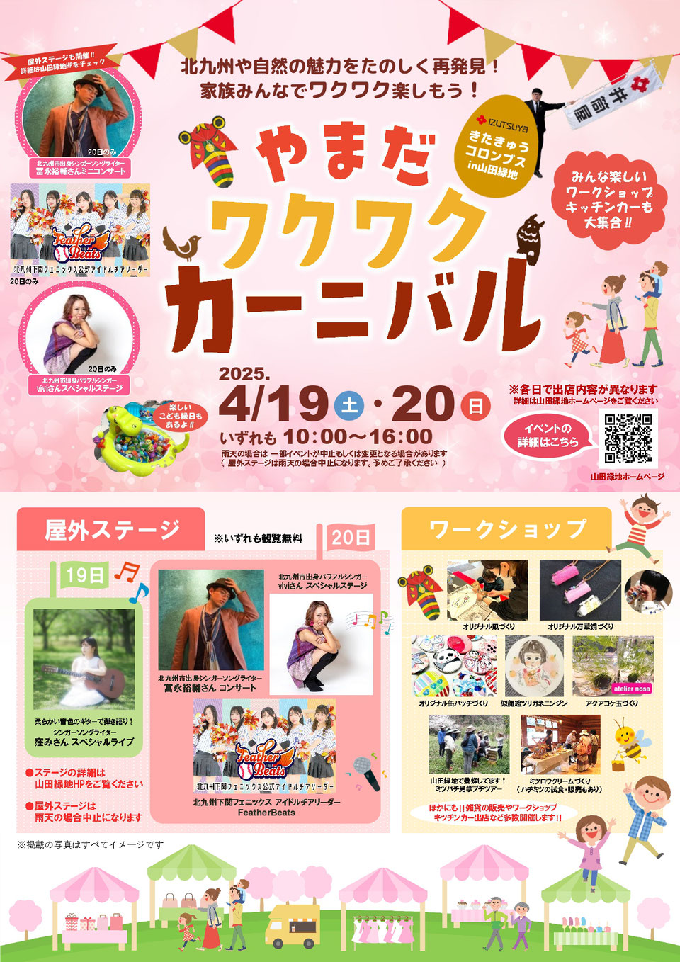 北九州や自然の魅力をたのしく再発見!家族みんなでワクワク楽しもう!工作ワークショップ、こども縁日など、楽しいイベントが大集合!屋外ステージイベントも開催します。北九州近郊・地元の商品も多数お届け♪家族みんなでワクワク楽しめるイベントです。 お一人でもよし♪ご家族や、ご友人、恋人同士でも★「山田の森」を満喫しにぜひお越しください。