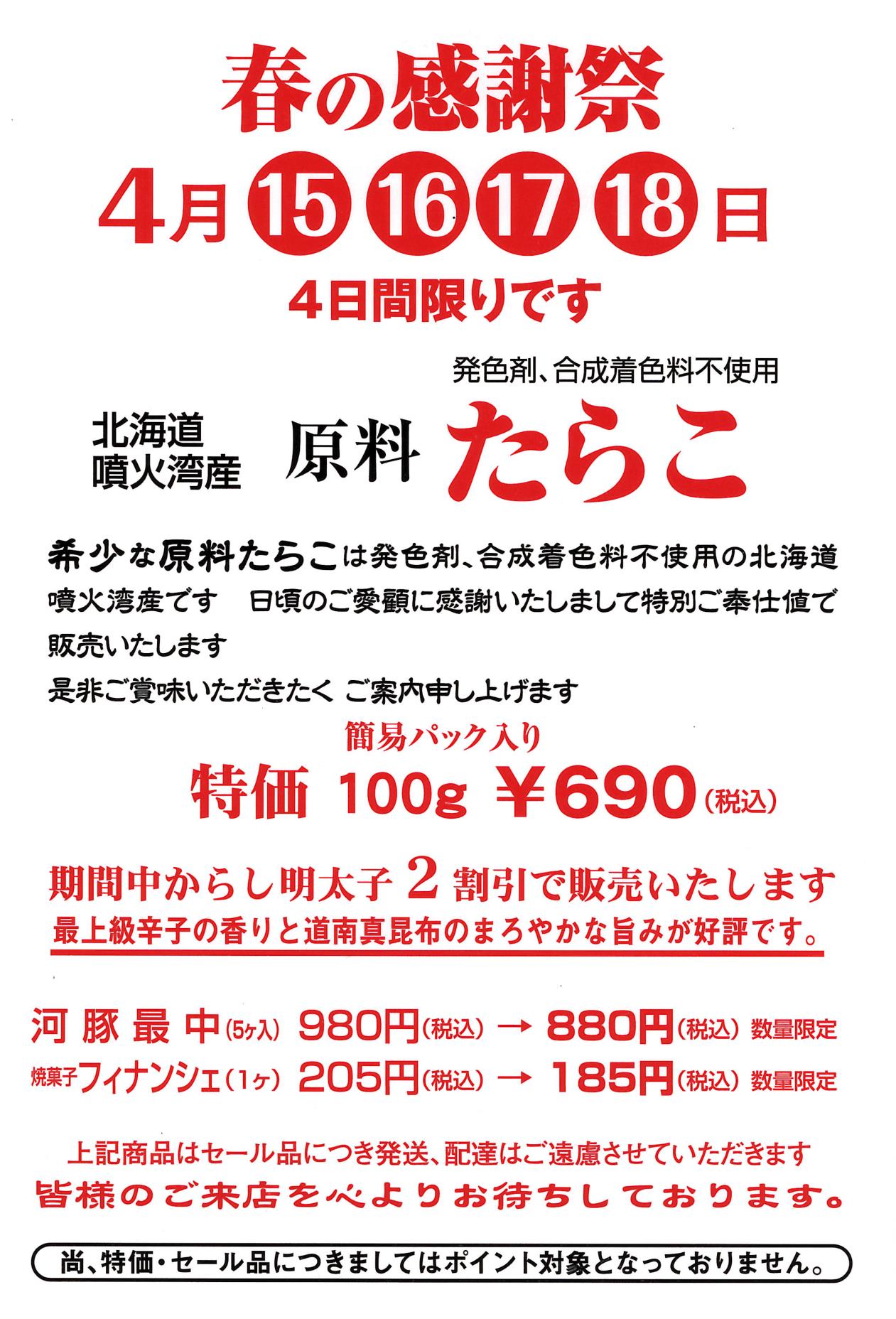 日頃の感謝を込めて4月15日~18日の4日間限定で<春の感謝祭>を開催します。発色剤・合成着色料を使用していない希少な原料のたらこで製造した、まろやかな旨みが好評のからし明太子。期間中は原料のたらことからし明太子をそれぞれ販売いたします。河豚最中やフィナンシェなども店頭限定の特別価格で販売しております。ぜひこの機会に梅園自慢の味をご賞味ください。