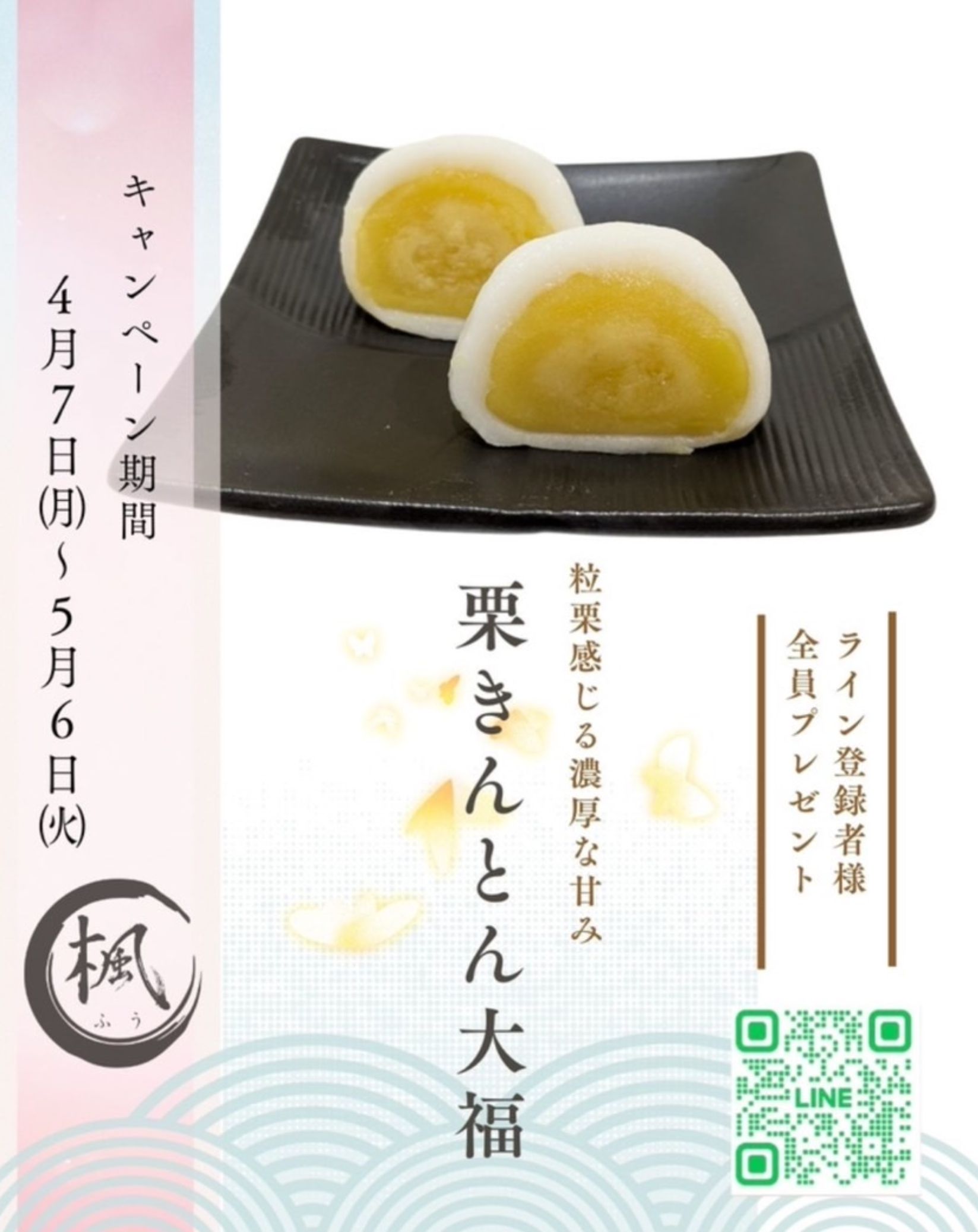 <栗きんとん大福>プレゼントキャンペーンを開催いたします!濃厚な栗きんとん餡の中に、ゴロゴロ粒栗を練りこんで、ふんわり柔らかな羽二重餅との相性抜群です♪新規でLINE登録の方だけでなく、既存の登録者様全員にプレゼント!!皆様のご来店心より お待ち申し上げております