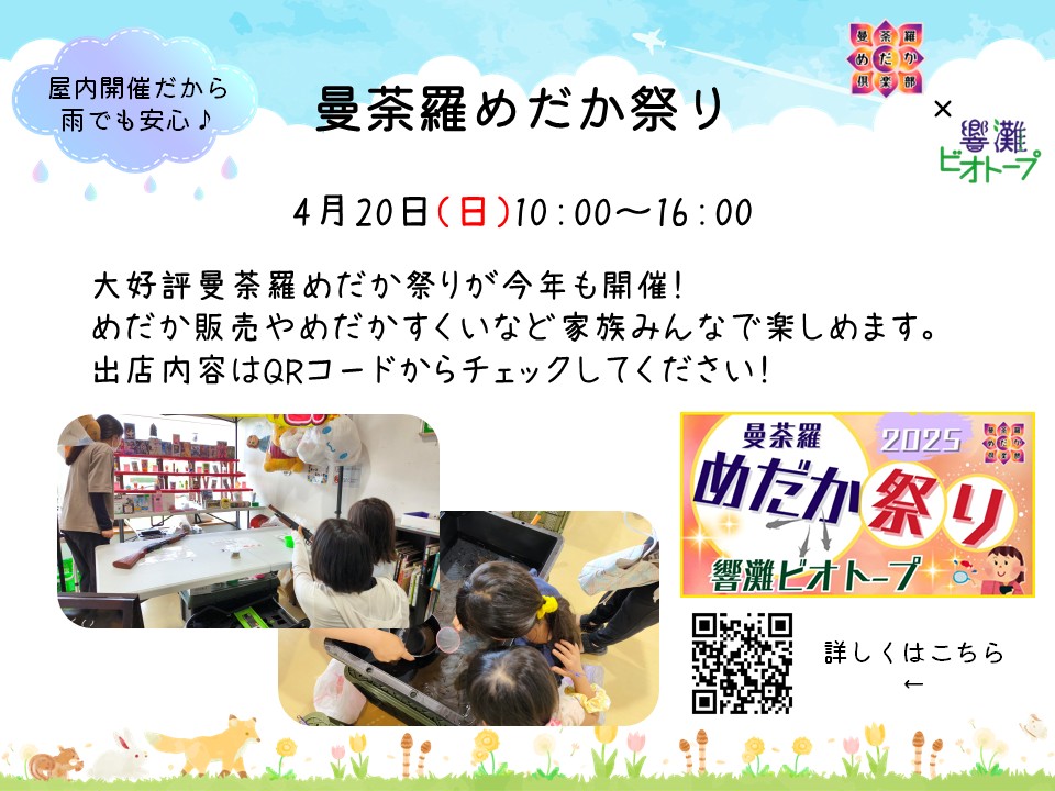 響灘ビオトープでめだか祭りを開催!様々な種類のめだか販売、めだかすくいやエビ釣りなど家族みんなで楽しめ、屋内開催なので気温や天候を気にせず遊べます!当日はキッチンカーもやってきます。