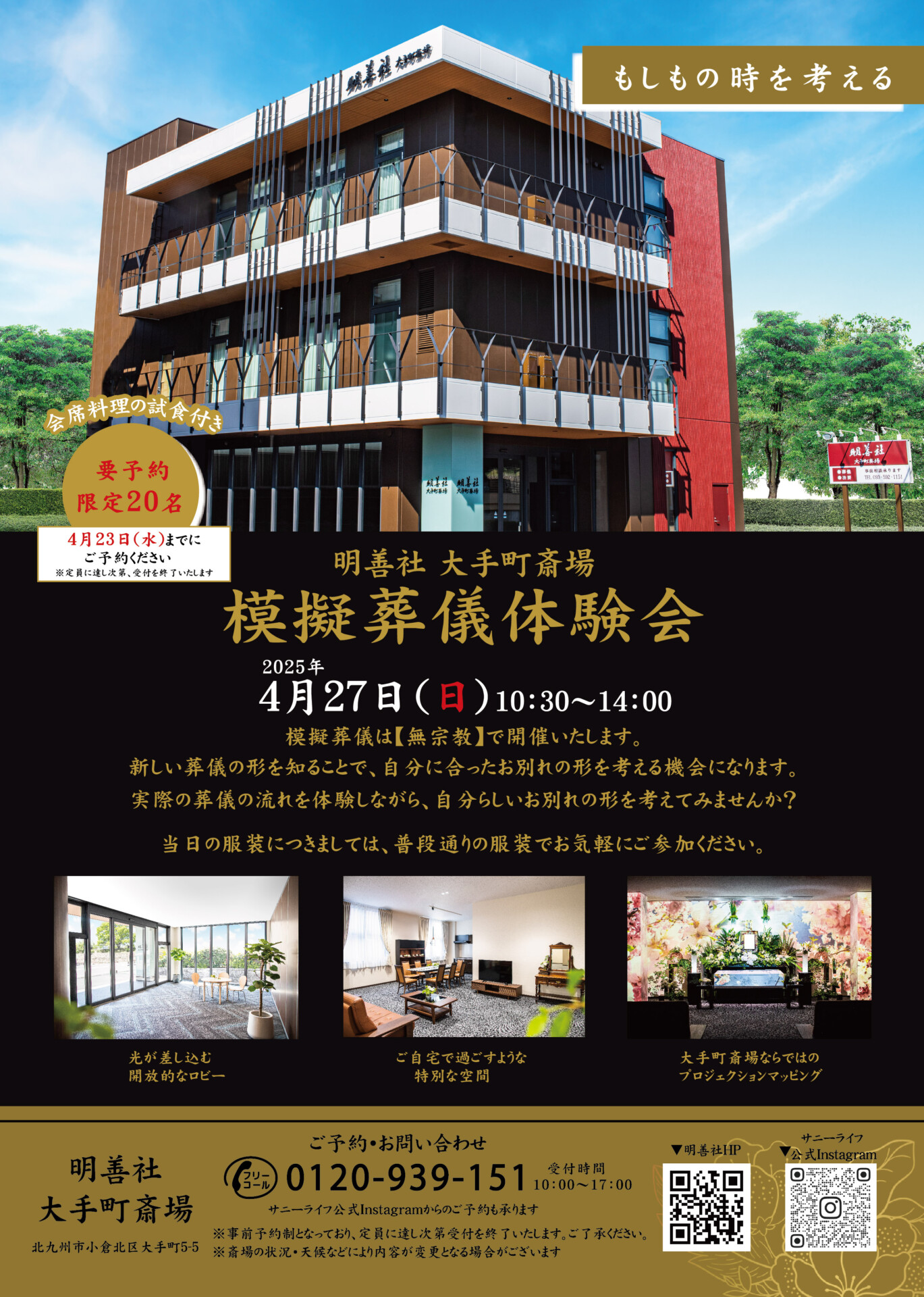 2025年4月27日(日)10:30~14:00、明善社 大手町斎場にて「模擬葬儀体験会」を開催いたします!模擬葬儀は「無宗教」で開催いたします。新しい葬儀の形を知ることで、自分に合ったお別れの形を考える機会になります。実際の葬儀の流れを体験しながら、自分らしいお別れの形を考えてみませんか?ぜひお気軽にご参加ください!