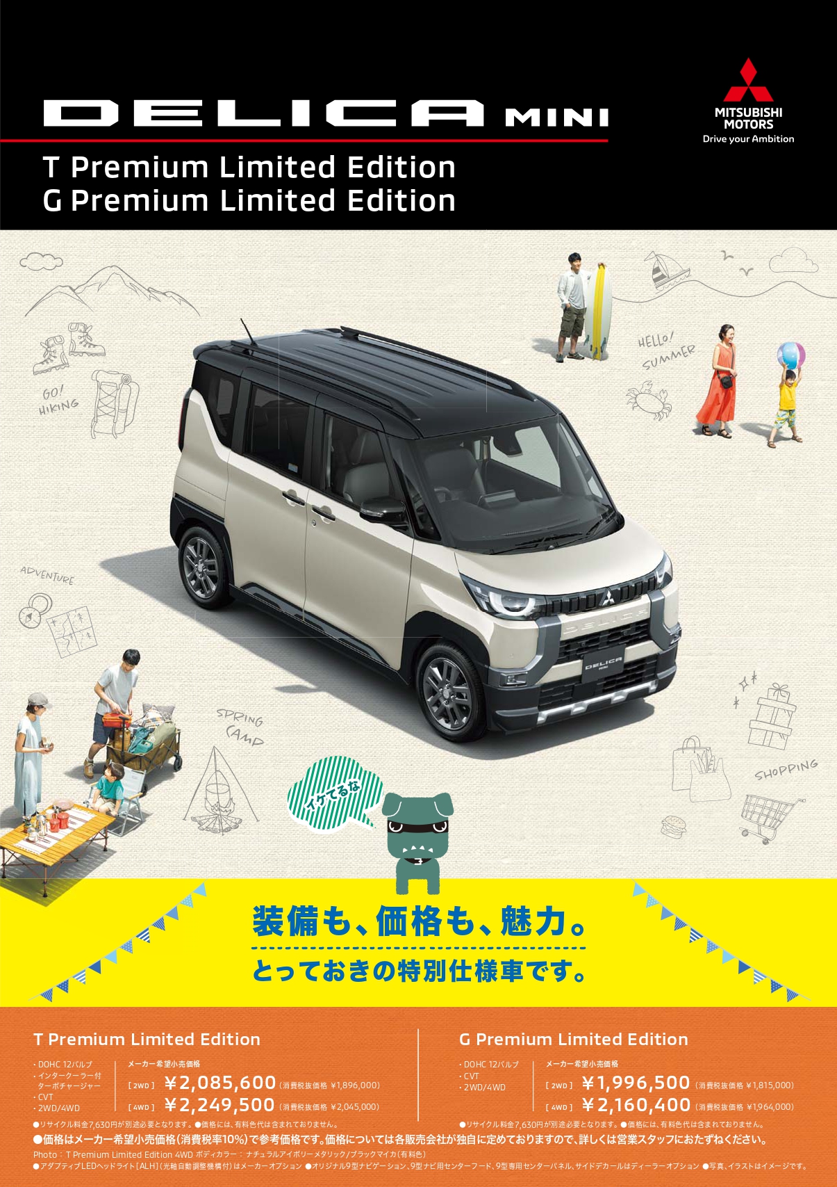 デリカミニ 特別仕様車『T Premium Limited Edition』『G Premium Limited Edition』を6月5日に発売いたします。デリカミニの一部装備を見直したお求めやすい価格となった<特別仕様車>です。 現在、ご注文を受付中です。店頭にてリーフレットもございますので、お気軽にお問い合わせください。 皆様のご来店をお待ちいたしております。