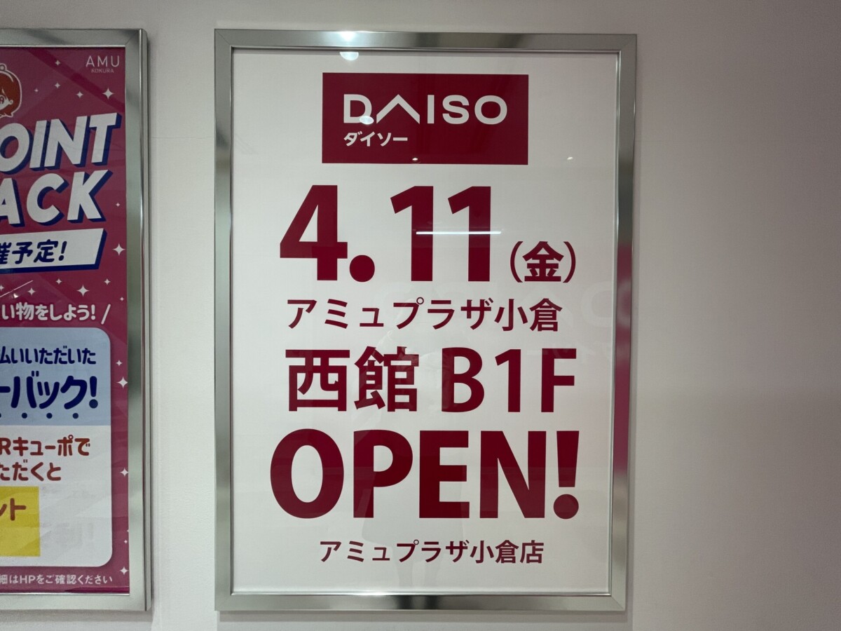 アミュプラザ小倉(北九州市小倉北区浅野1-1-1)の西館地下1階に4月11日、「DAISO アミュプラザ小倉店」がオープンしました。