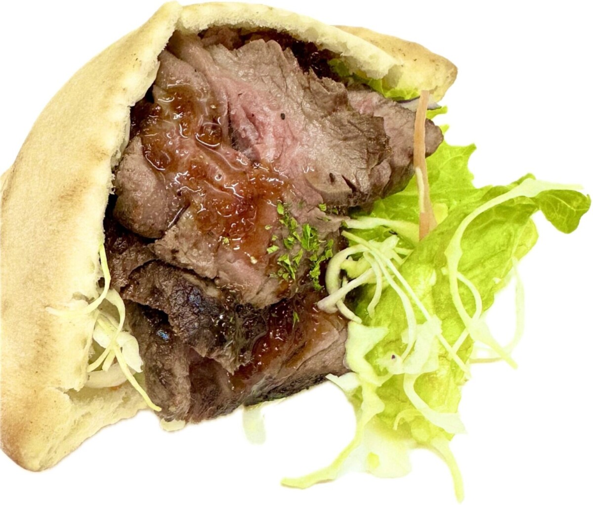 牛1頭あたりから約2キロ程度しか取れない希少部位のミスジが使用されており、柔らかく旨みが広がるのだとか。オリジナルのソースがピタパンに挟んだ野菜とマッチしています。