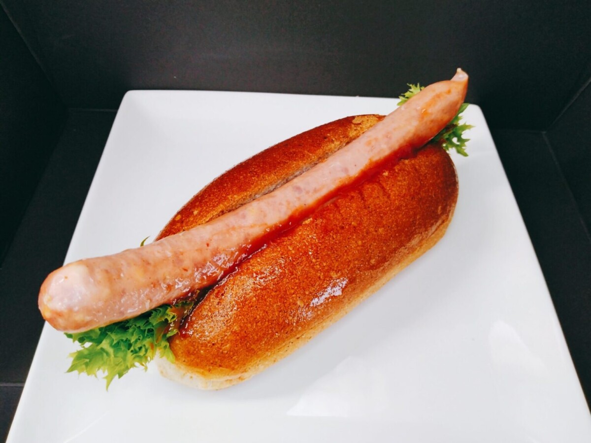 本場ドイツのコンテストで金メダルを受賞した豊前みやこハムのウインナーと、国産小麦全粒粉のドッグパンで作られたホットドッグです。