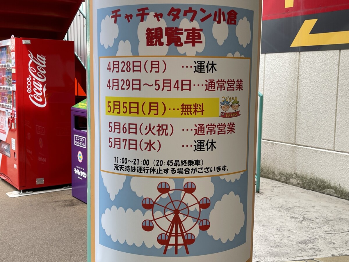 5月5日<子どもの日>は、観覧車の無料開放を実施。時間は午前11時から午後9時まで。最終乗車は午後8時45分までとなっています。
