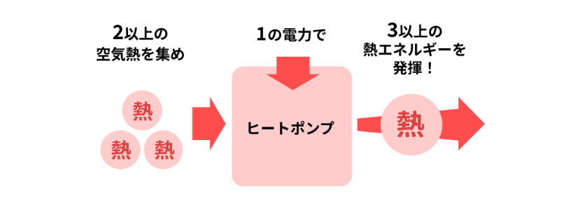 例えば、1の電気エネルギーと2以上の空気の熱を利用すると、3以上の熱エネルギーを得られ効率的です。