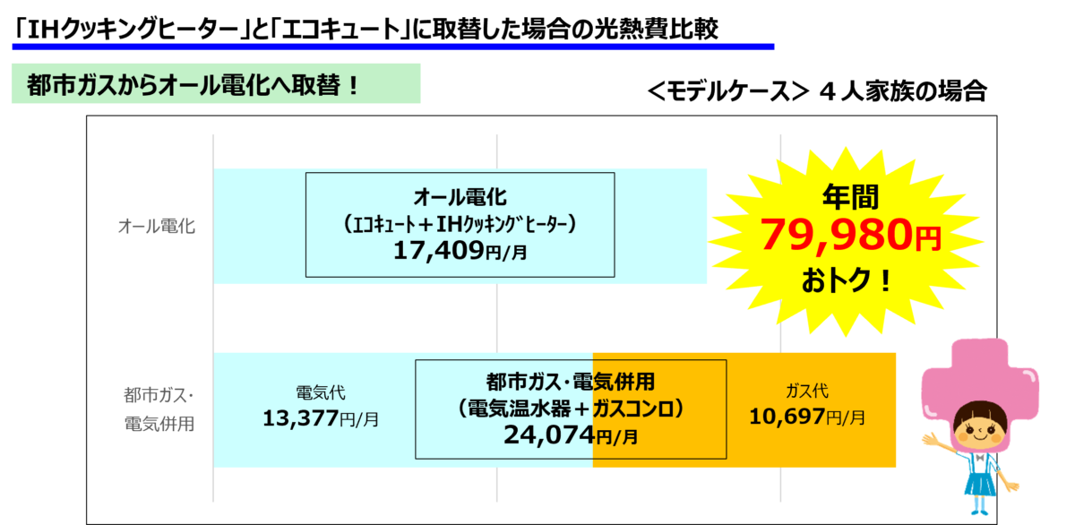 例えば、都市ガス・電気併用の4人家族がオール電化へ取り替えた場合を比較してみます。
