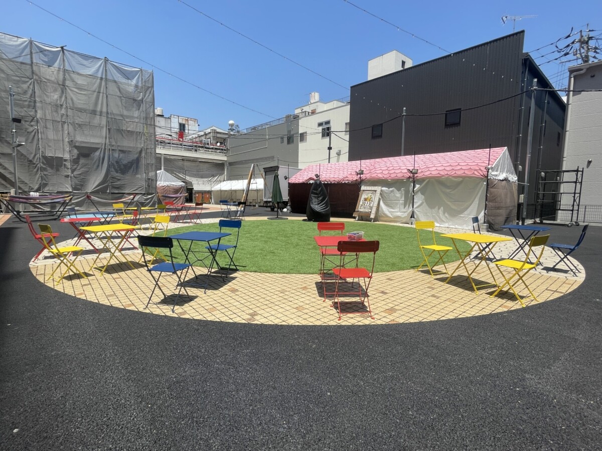 たくさんのカラフルな椅子やテーブルが並ぶ広場