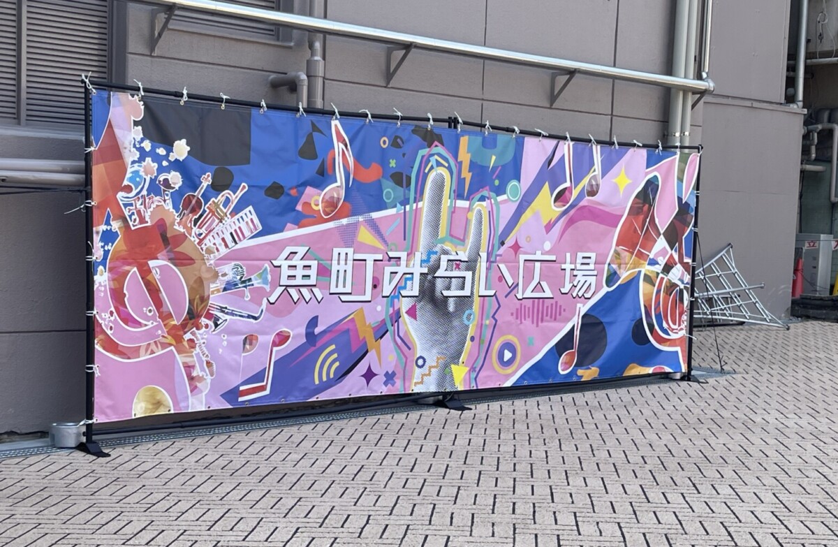 「魚町みらい広場」と書かれたカラフルな看板が印象的。また、今後開催するイベントで使用するのか、大きなスクリーンのようなものもありましたよ。