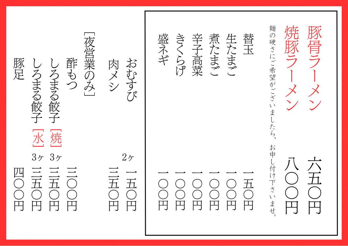 豚骨ラーメンをはじめ、夜営業限定で餃子なども味わえるお店です。
