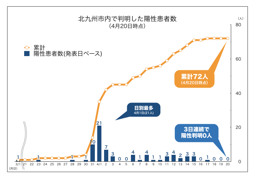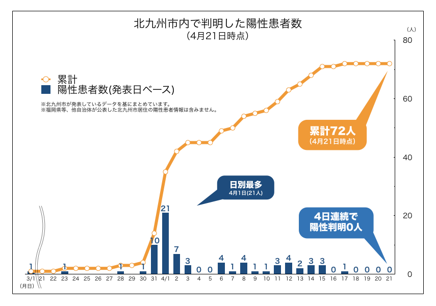 【新型コロナ/北九州】4月21日時点の感染者推移 4日連続で感染者ゼロ