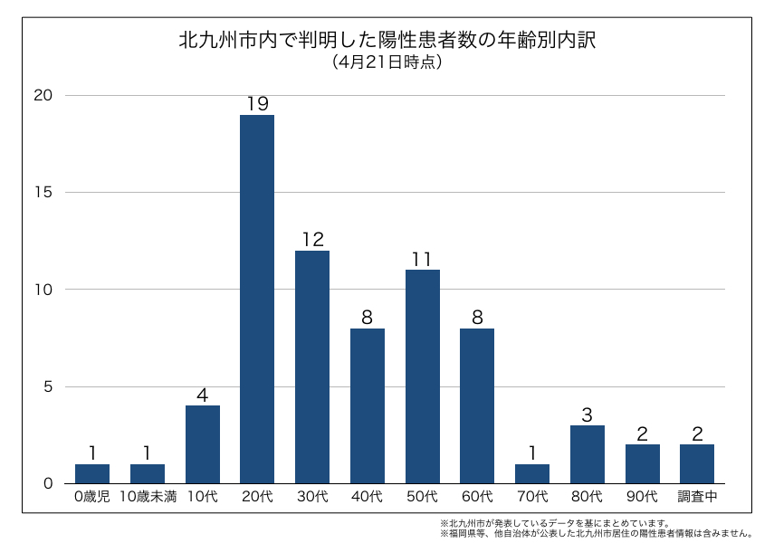 昨日までに公開した記事の本文およびグラフのデータに誤りがありました。お詫びして訂正いたします。「30歳代」を「13人」としていましたが、正しくは「12人」。「調査中」を「1人」としていましたが、正しくは「2人」。「小倉北区」を「19人」としていましたが、正しくは「18人」。「門司区」を「12人」としていましたが、正しくは「13人」です。なお、記事内で使用しているデータは、北九州市が発表している情報を基にまとめています。福岡県等、他自治体が公表している北九州市民は含まれません。一方、周辺自治体在住者で北九州市内で検査、判明した人の情報が含まれます。