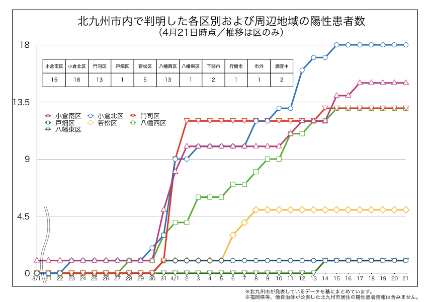 数は北九州市の発表日ベース。いずれもクルーズ船などの人数を含みません。