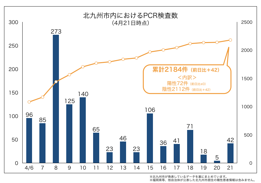 北九州市は、PCR検査を行った人数と、検査結果を連日発表しています。これによると、4月21日の市内の検査数は42件。累計は2184件となりました。陽性率は3.3%です。