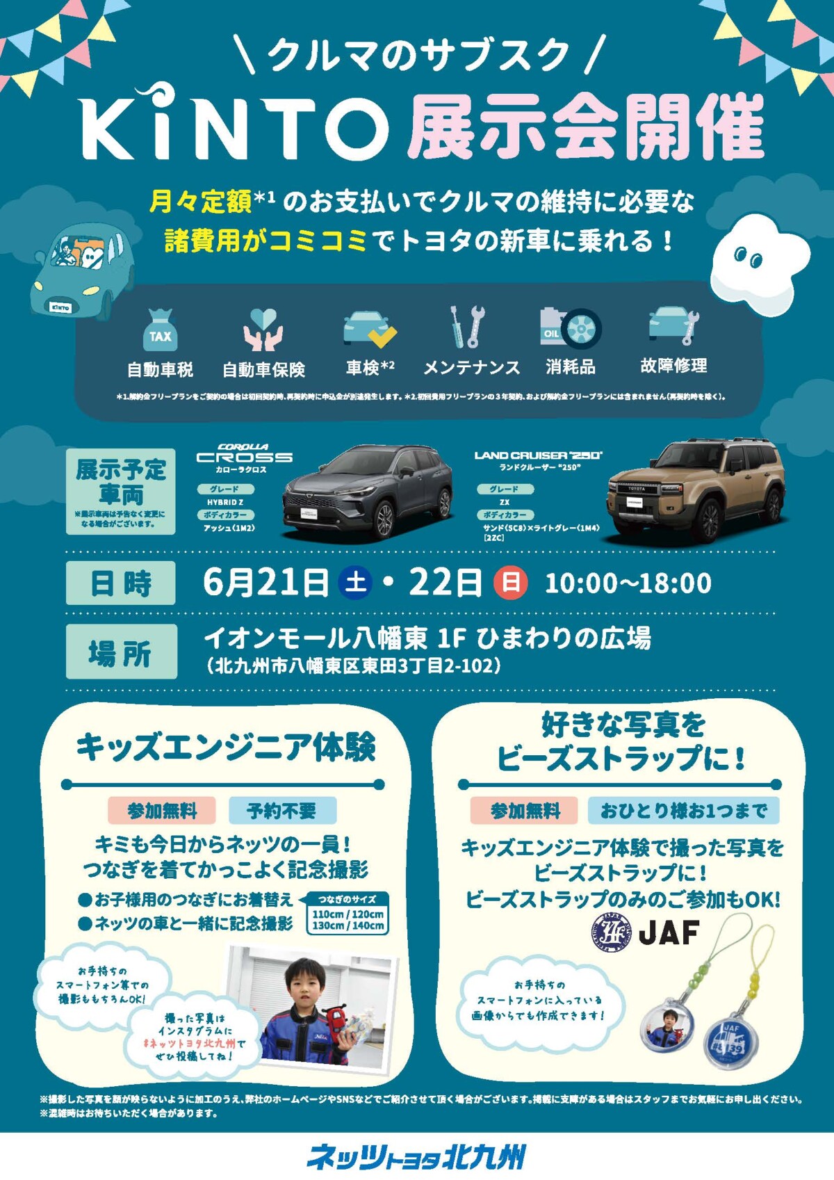 イオンモール八幡東(北九州市八幡東区東田3-2‐102)の1階ひまわり広場で6月21日と22日、車のサブスクリプションサービス「KINTO」の展示会が開催されます。