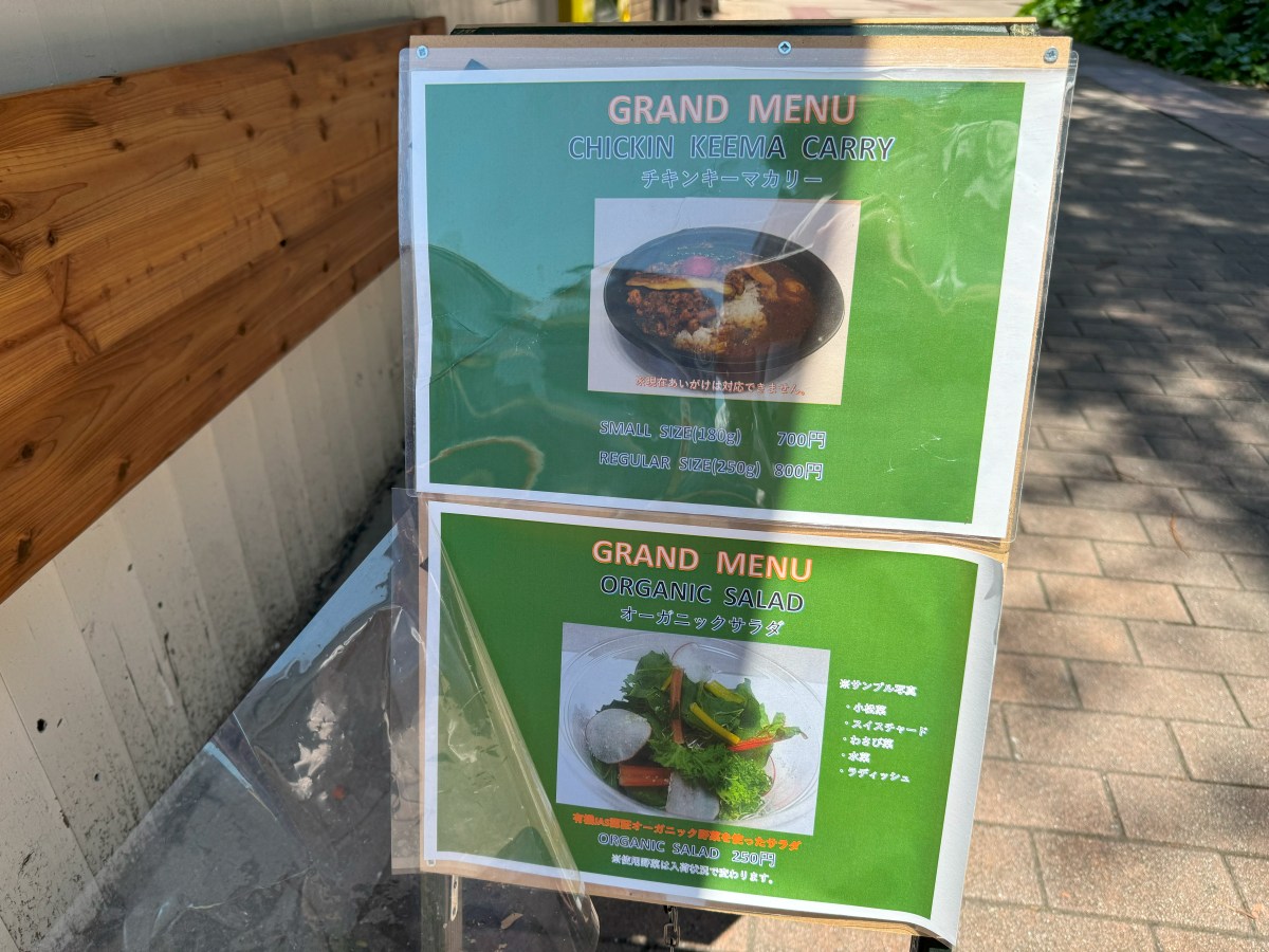 メニューはシンプルに、チキンキーマカリー Sサイズ180g(700円)とレギュラーサイス250g(800円)、有機野菜のオーガニックサラダ(250円)のみ。