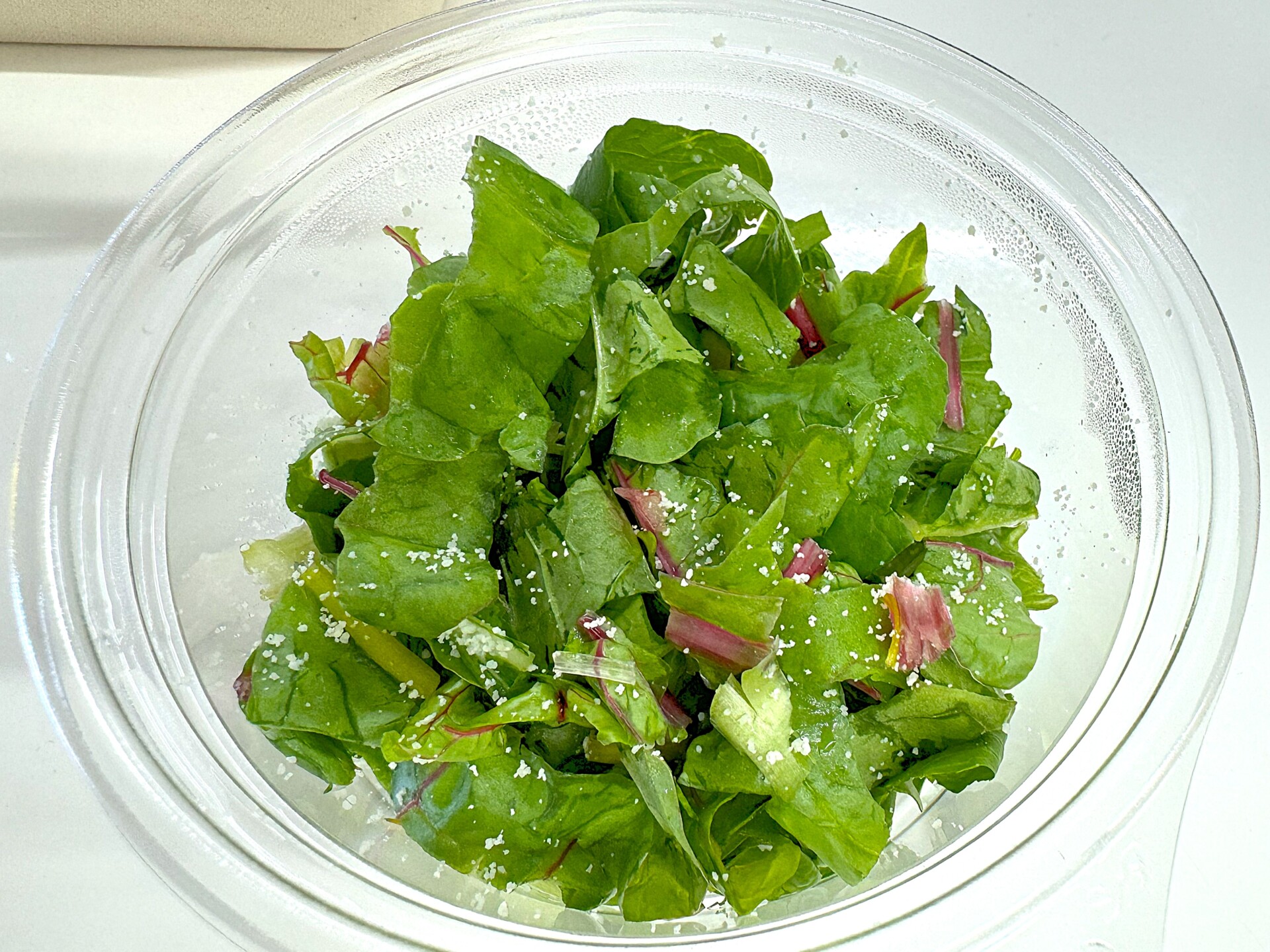 オーガニックサラダには、瑞々しいスイスチャードが使われ、粉チーズとの組み合わせがさっぱりとした味わいでした。