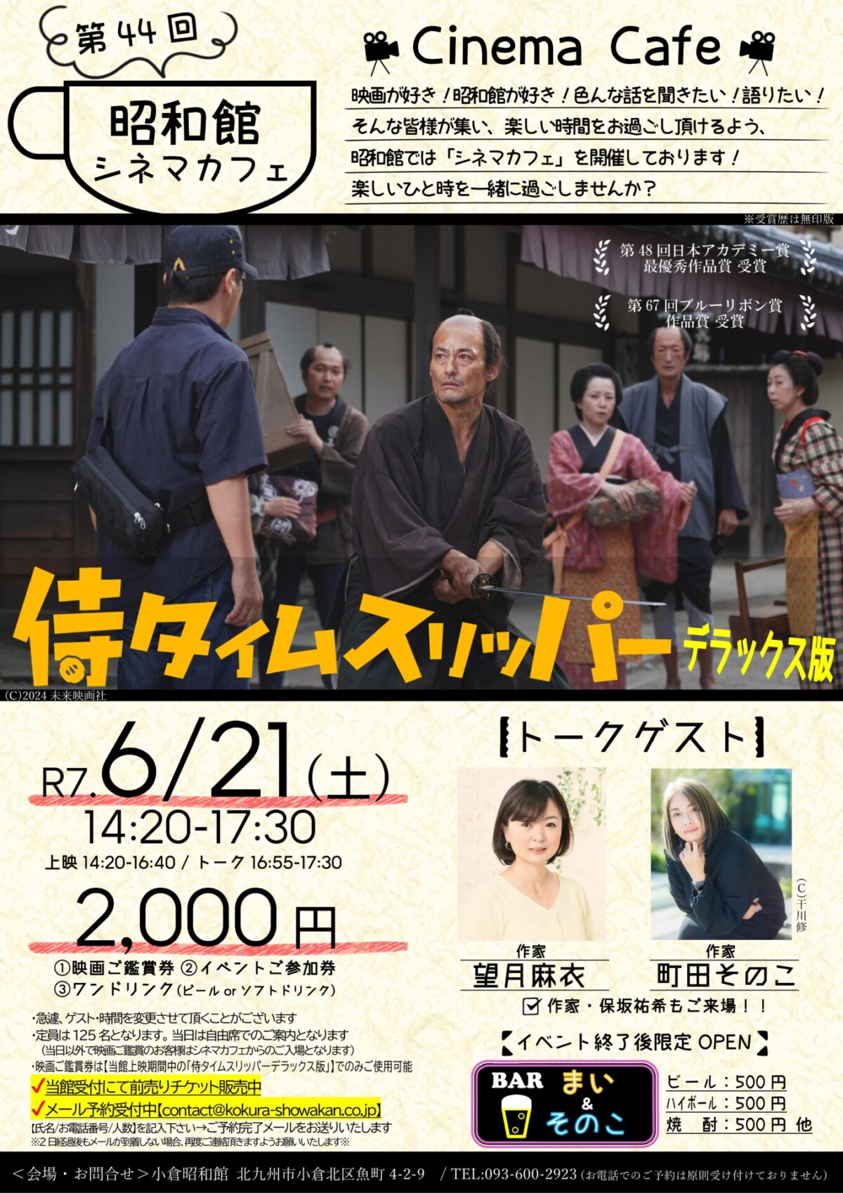 当日は、第48回日本アカデミー賞の最優秀作品賞・ 第67回ブルーリボン賞作品賞を受賞した映画『侍タイムスリッパーデラックス版』が上映され、鑑賞後にシネマカフェのイベントに参加できます。