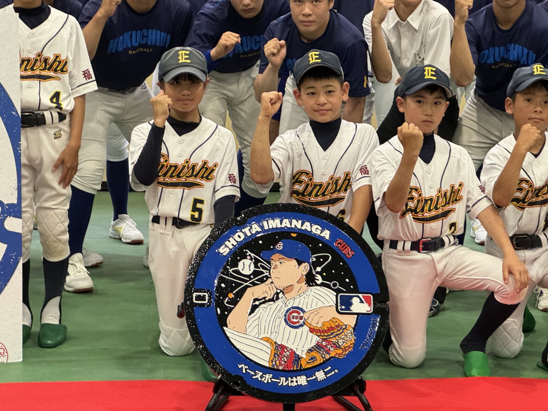 (お披露目された今永昇太選手デザインのマンホールカバー)今永選手が無名時代に努力し続けた「瀬板の森公園」に設置