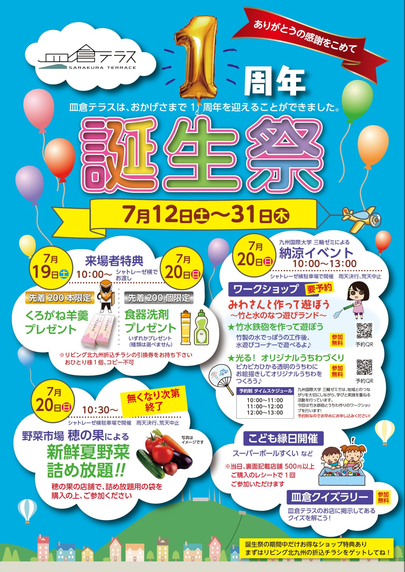 7月10日に開業1周年を迎える皿倉テラスは、この1年間の感謝の気持ちを形にし、そしてこれからさらに多くの人に皿倉テラスの魅力を知ってもらうために、7月12日~31日の期間で<誕生祭>を開催します。