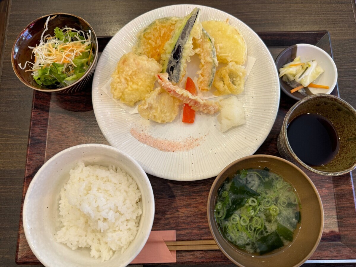 ランチは天ぷらをベースとした定食スタイル。この日、筆者が選んだ得々天ぷら定食(1000円)の内容は、とり天・キス・パプリカ・なす・カボチャ・玉ねぎの6種天ぷらに、ご飯・味噌汁・サラダ・漬物付き。