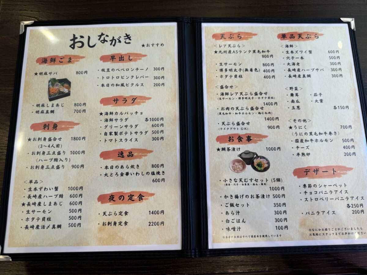 天ぷら以外にもお刺身盛り合わせや胡麻サバがラインナップ。
