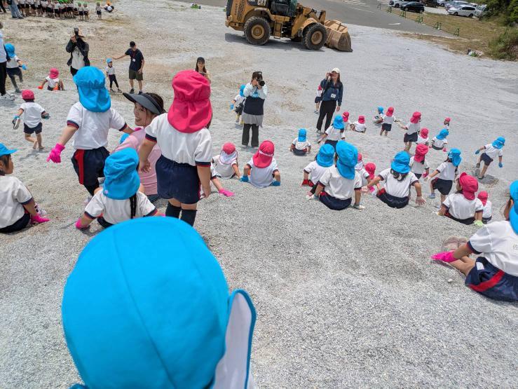 当日は、重機が動く処分場を安全な高台から見学。ユンボ(ショベルカー)が園児に向かって手を振ると、園児たちも大喜びしていました。