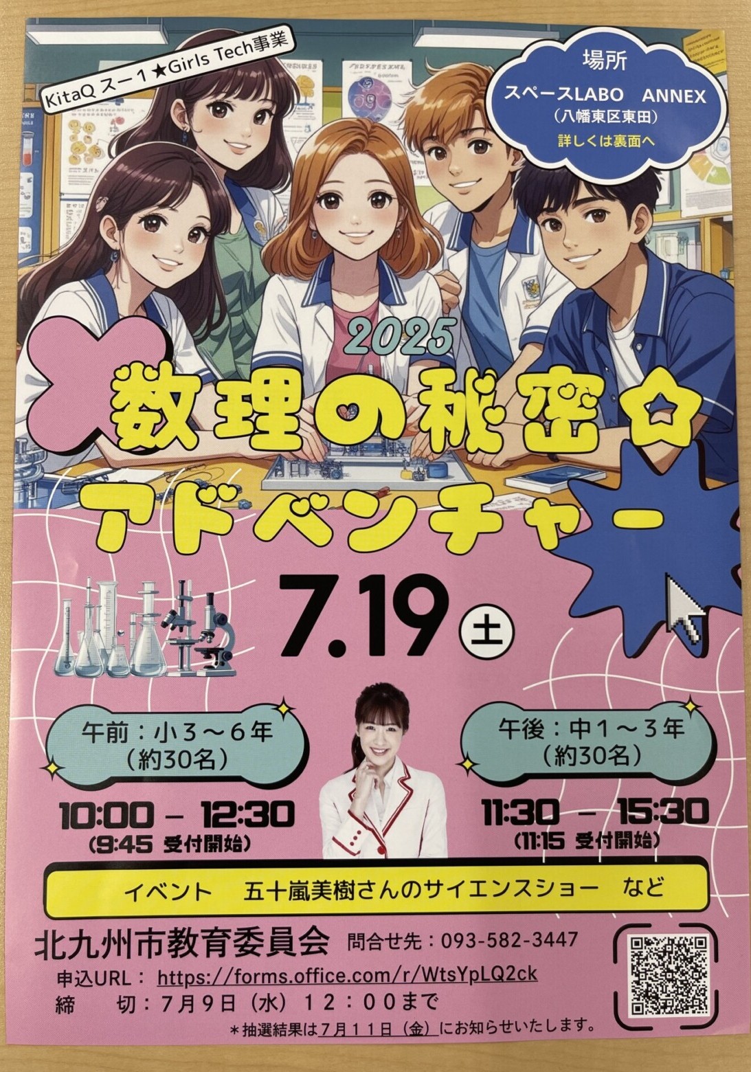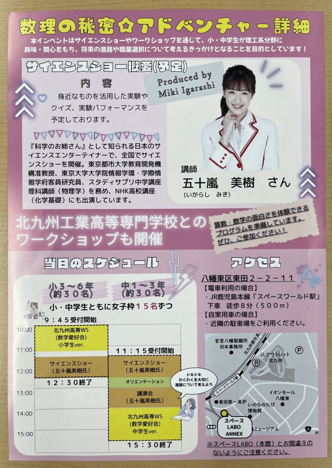 イベントは、2部制で実施。1部では、午前9時45分から小学3年生~6年生を対象に、北九州高専による「ワークショップ」とサイエンスエンターテイナー・五十嵐美樹さんによる「サイエンスショー」が開催されます。