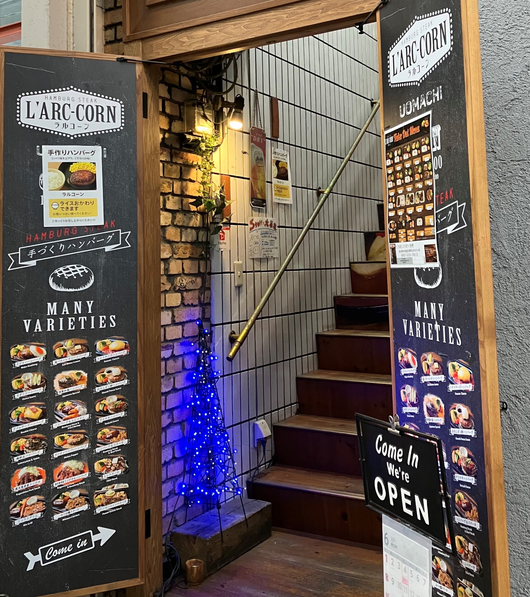 JR小倉駅からすぐの魚町銀天街から1分のところに、手作りハンバーグ「L’ARC- CORN(ラルコーン)」があります。