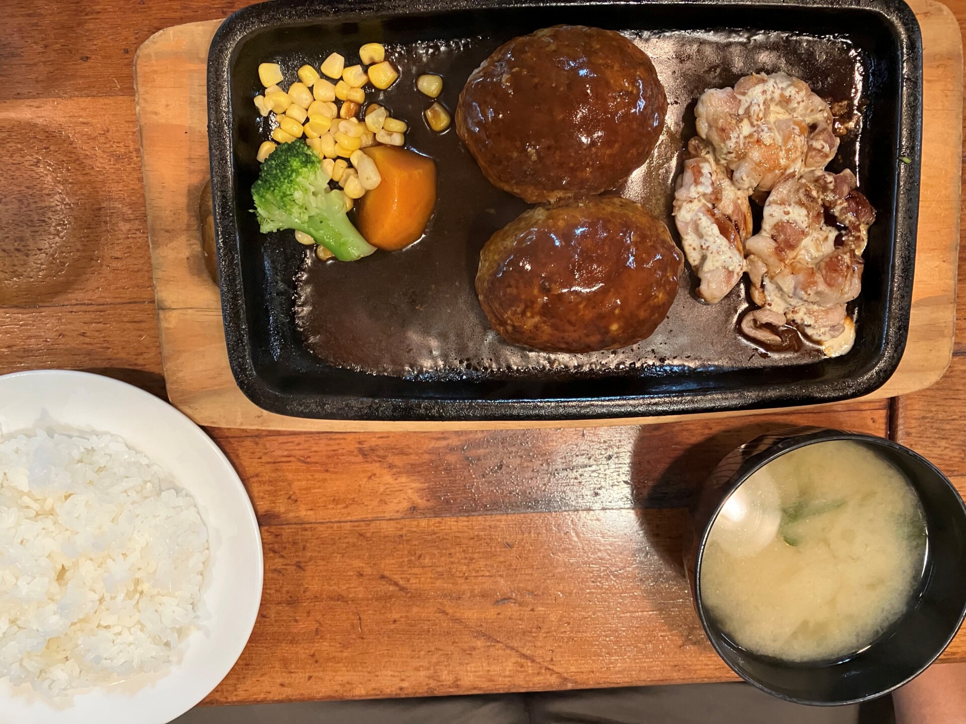 ハンバーグにはデミグラスソースが添えられ、チキンは醤油ベースの甘辛風味でご飯がすすむ味付けです。
