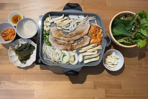 豚バラ肉を好みの野菜で包んで食べる「サムギョプサル」は、特製のタレを使用。ご飯はもちろんお酒も進む一品です。