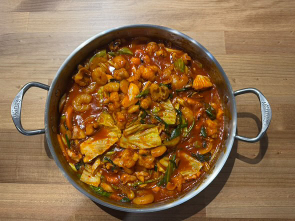 辛いものが好きな人におすすめの「ナッコプッセ」。マルチョウホルモン、エビやタコ、野菜を甘辛く炒めたメニューです。