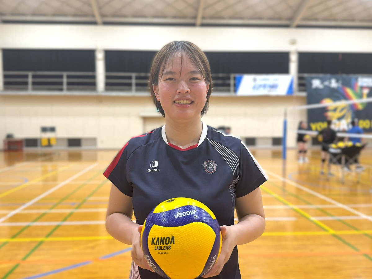 現役選手の横田希歩さん(24歳)は、180cmのアウトサイドヒッター。日頃から低学年や初心者にも指導を行っており、「バレーの楽しさを伝えることが一番大事」と語ります。