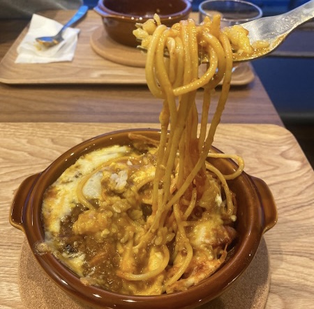 焼きカレーといえば、一般的には「ご飯」が入っていますが、同店の焼きカレーにはナポリタンを使用。喫茶店で食べたいメニュー「ナポリタン」と「カレー」の2つを同時に味わえるように作ったのだそうです。