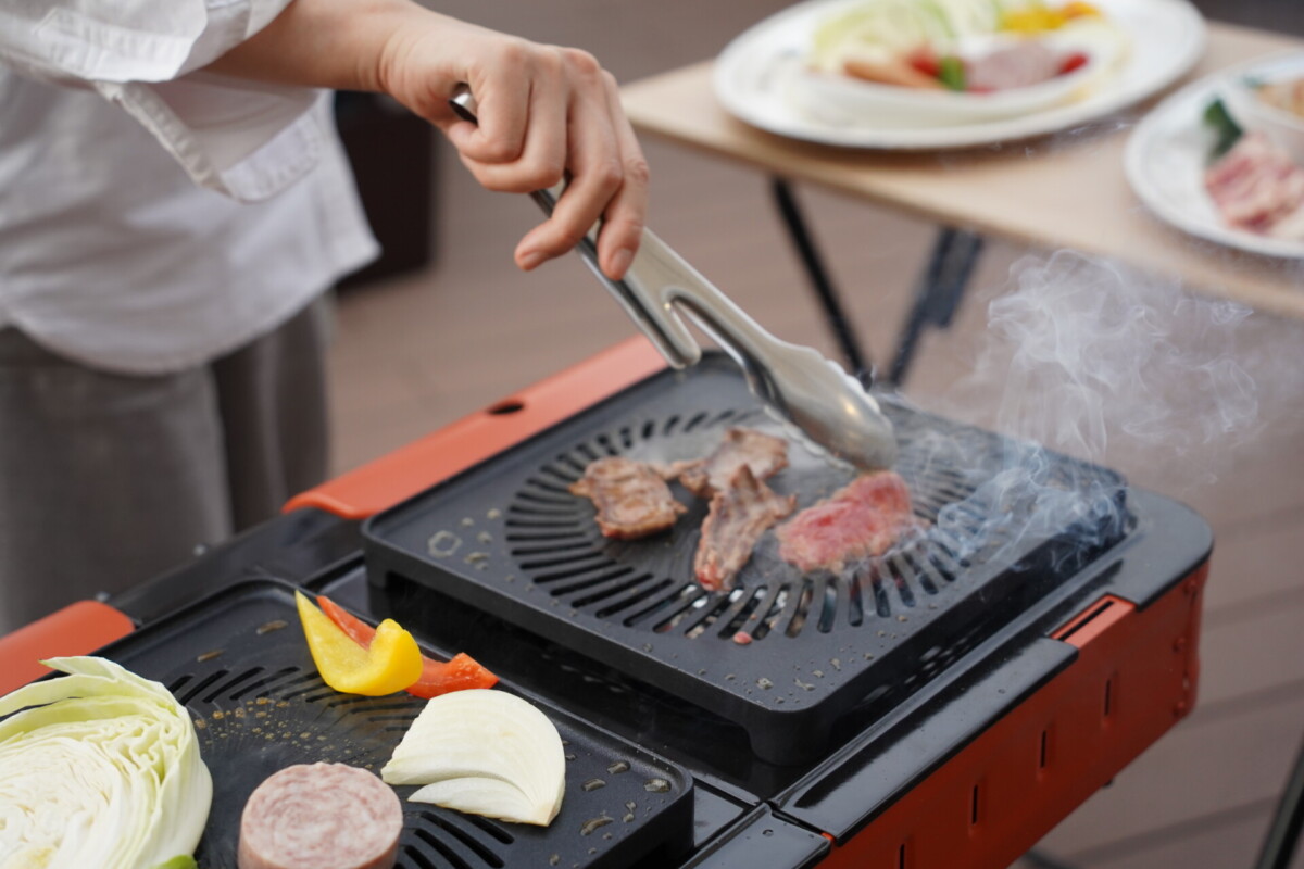 開始時間になりスタッフに案内された会場の席は、木製のテーブルや椅子、大型パラソル、2口コンロがセットされた空間。