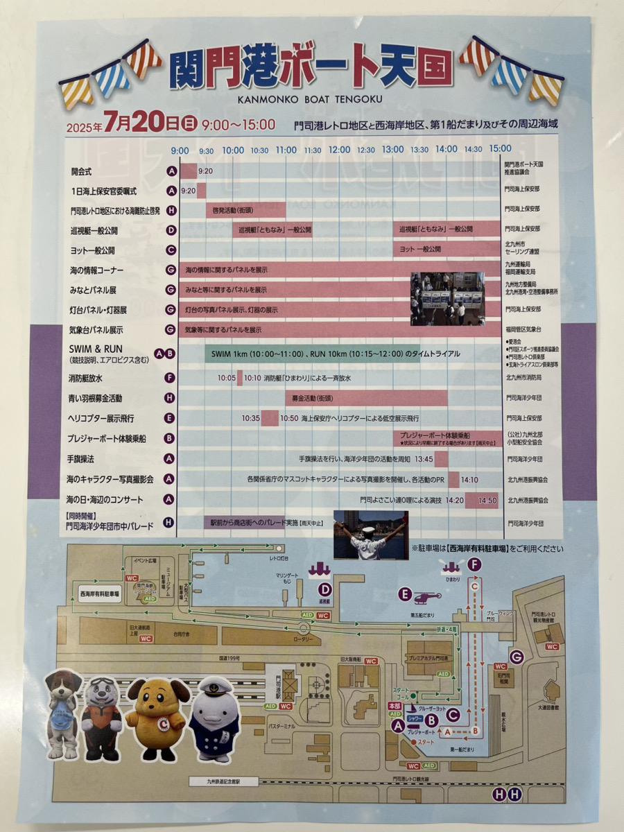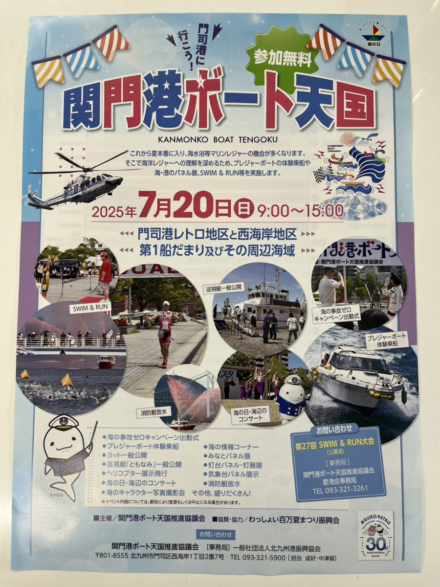当日は、「プレジャーボート体験乗船」、北九州市消防局のカラーガード隊による「海の日・海辺のコンサート」、海上保安庁ヘリコプターによる「低空飛行展示」などを実施します。