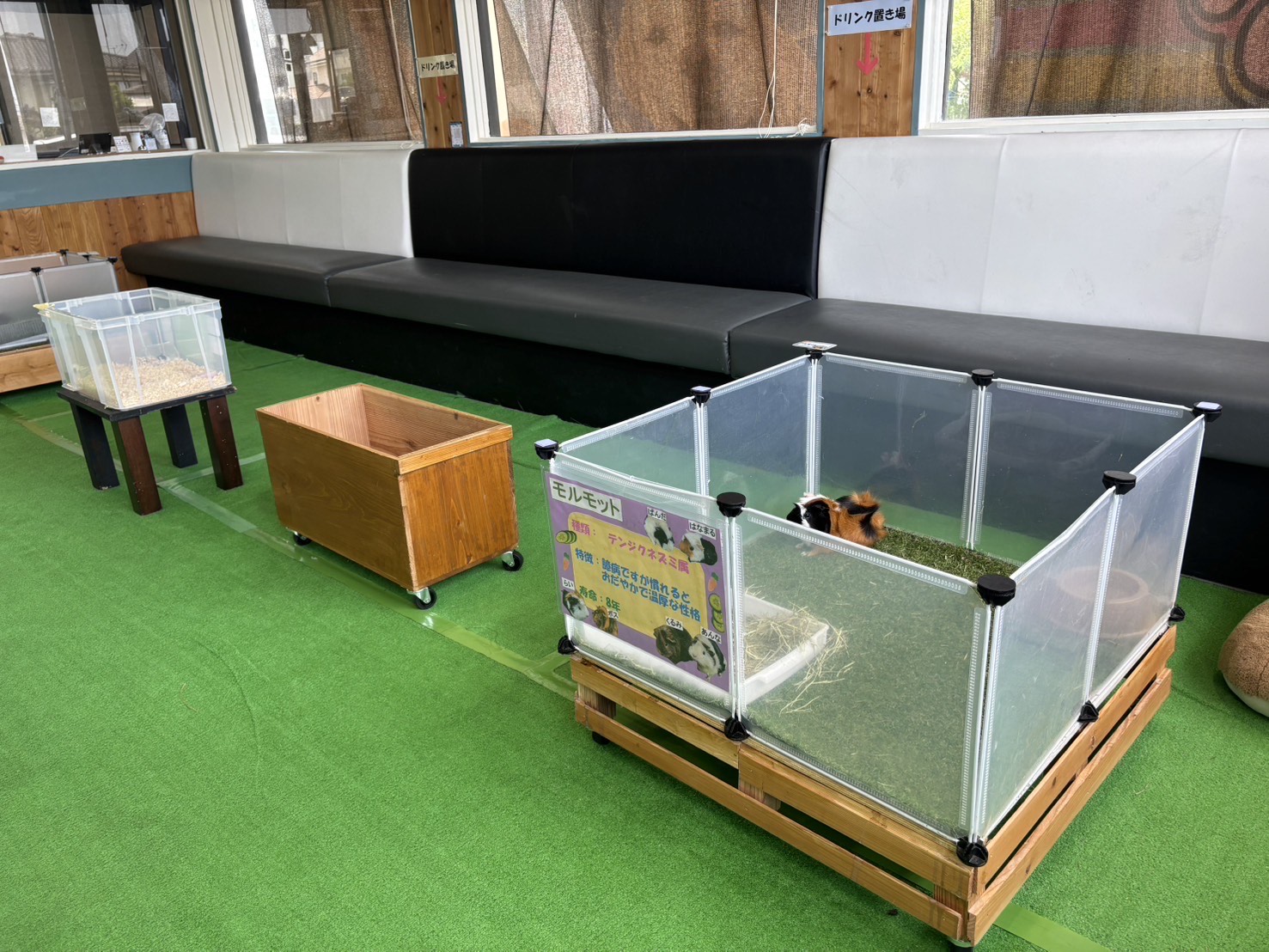 店内は木目調を基調としたナチュラルなデザインで、人も動物もリラックスできる癒しの空間。触れ合いエリアは安全面にも配慮され、動物の種類ごとにコーナーが分かれています。