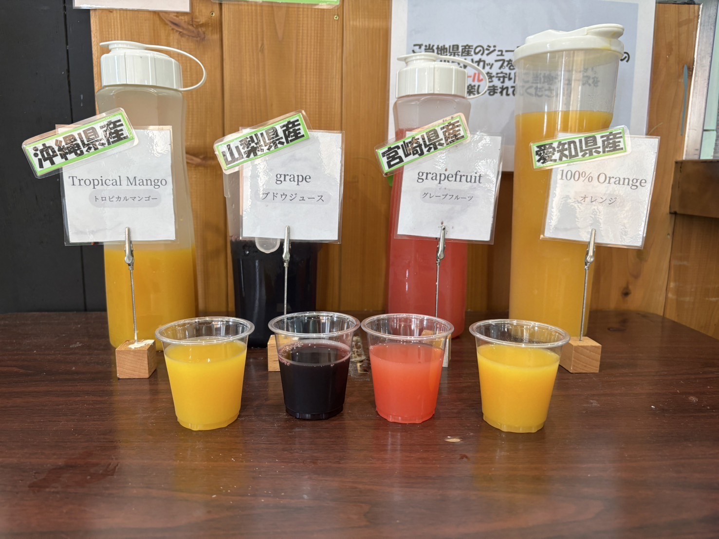 ・愛知県産オレンジ100%・山梨県産グレープジュース・宮崎県産グレープフルーツジュース・沖縄県産トロピカルマンゴー