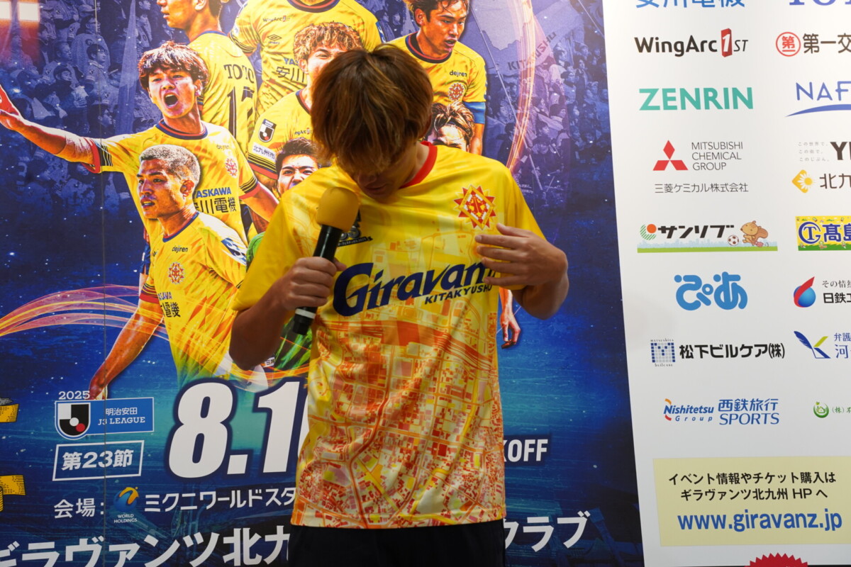 ギラフェスオリジナルシャツについて感想を聞かれた井澤選手は「デザインがかっこいいです。着心地は、軽くて涼しそうですね」と話し、「たくさんの方にスタジアムに来てもらい、満員にしてもらった中で最高の結果を残して、勝利の花火を楽しみたい」と意気込みを語りました。