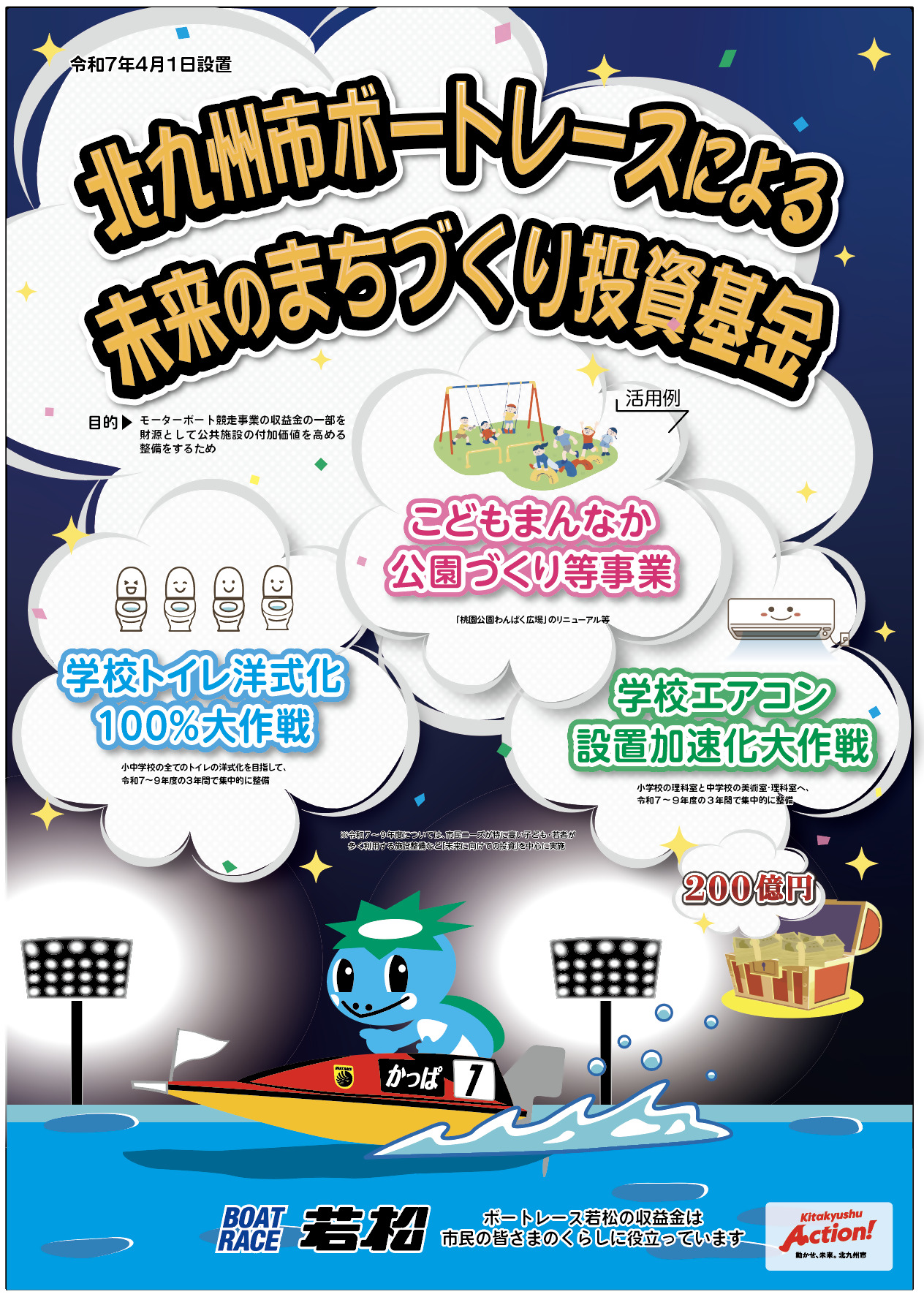 令和7年4月1日より、北九州市はモーターボート競走事業の収益金の一部(200億円)を財源として、公共施設の付加価値を高める整備をすることを目的に「ボートレースによる未来のまちづくり投資基金を設置しました