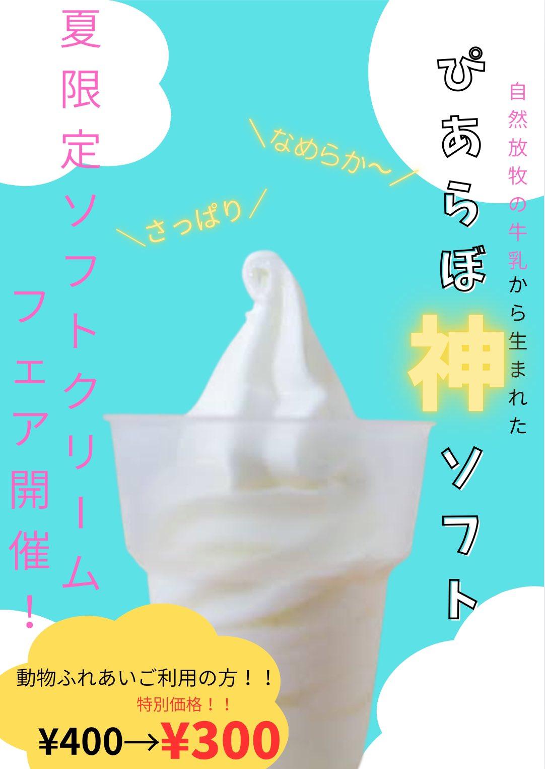 夏限定の<ピアラボ神ソフト>が登場です!動物ふれあいご利用の方は、通常価格400円が特別価格の300円になります!ぜひ、かわいい動物たちに癒された後、さっぱり美味しいソフトクリームをご堪能ください。ソースは、チョコレートソース・マンゴーソース・抹茶ソース・キャラメルソース・ストロベリーソースから選べますよ!