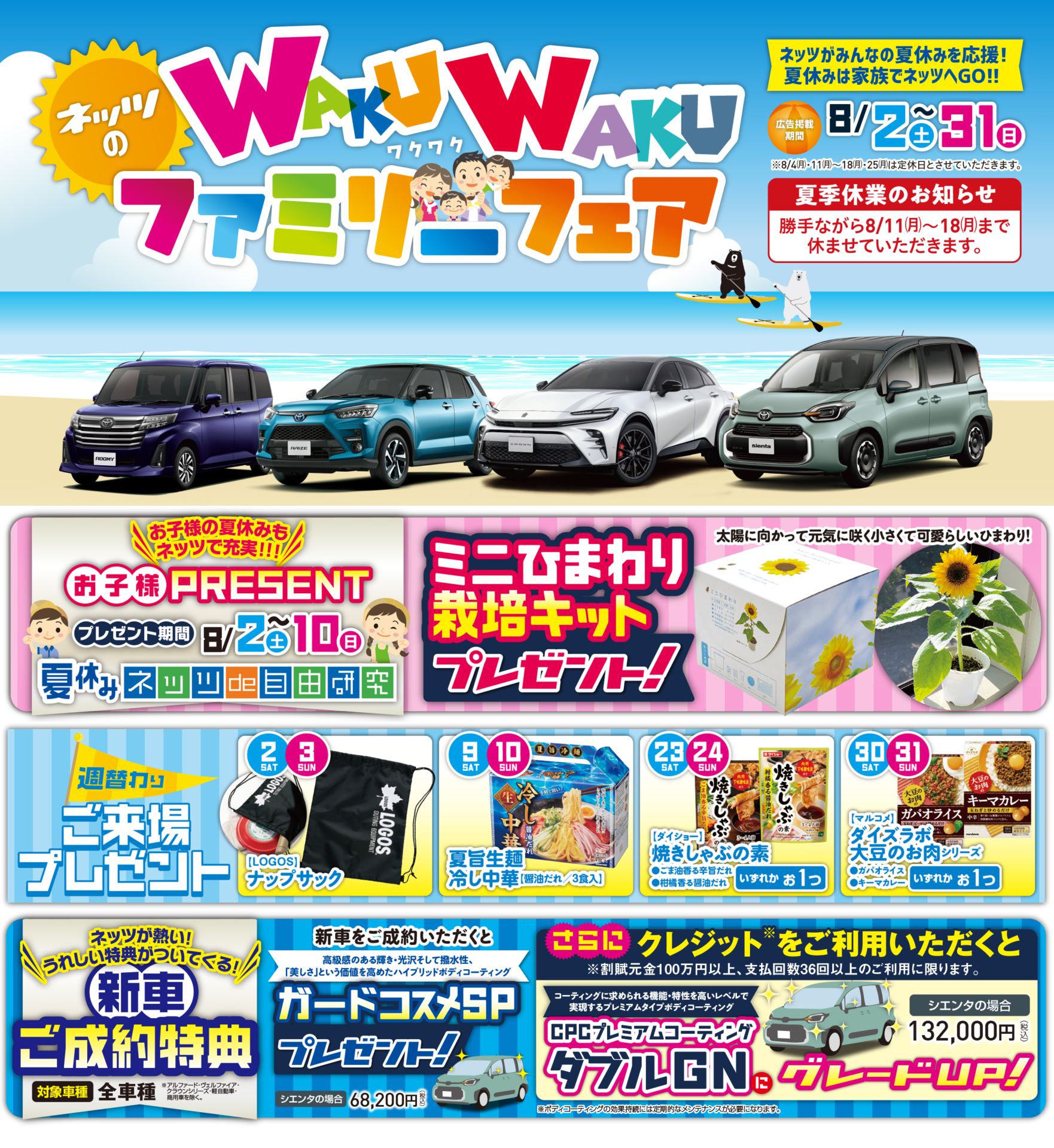 ネッツがみんなの夏休みを応援!新車をご成約頂くとボディコーティングガードコスメSPをプレゼント!8月2日(土)~10日(日)の期間中、ご来場のお子様にはミニひまわり栽培キットをプレゼント。週末は週替わりのご来場プレゼントもご用意しております。家族と夏を満喫するゴキゲンなクルマが勢ぞろい! 夏休みは家族でネッツへGO!