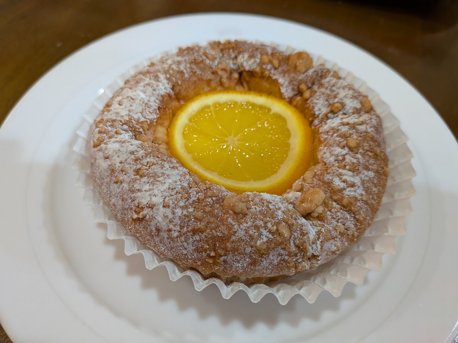 丸いパンの中央には、つややかなオレンジの輪切り、その下にはクリームチーズ、周りにはクランブルと粉糖がまぶされています。